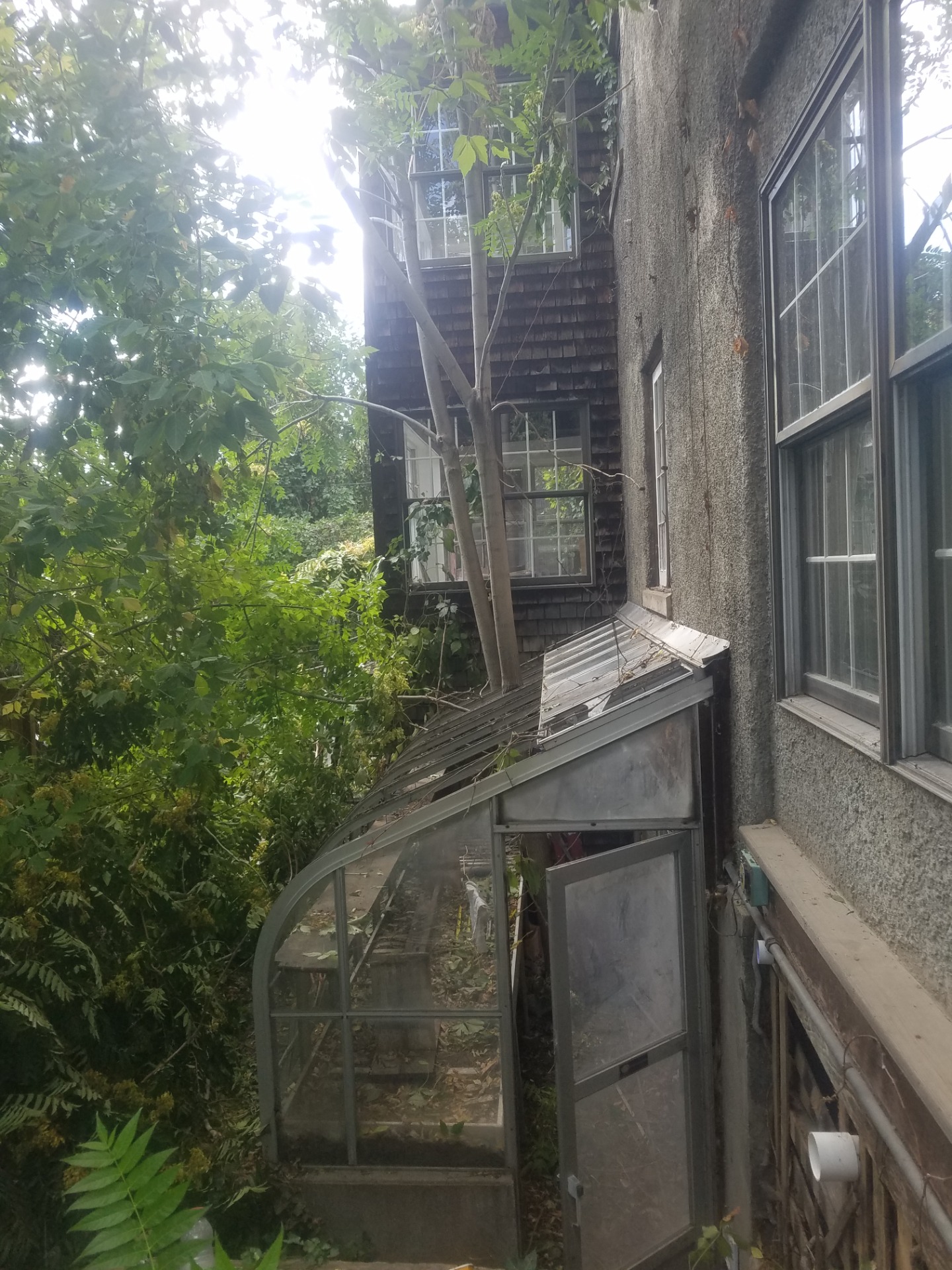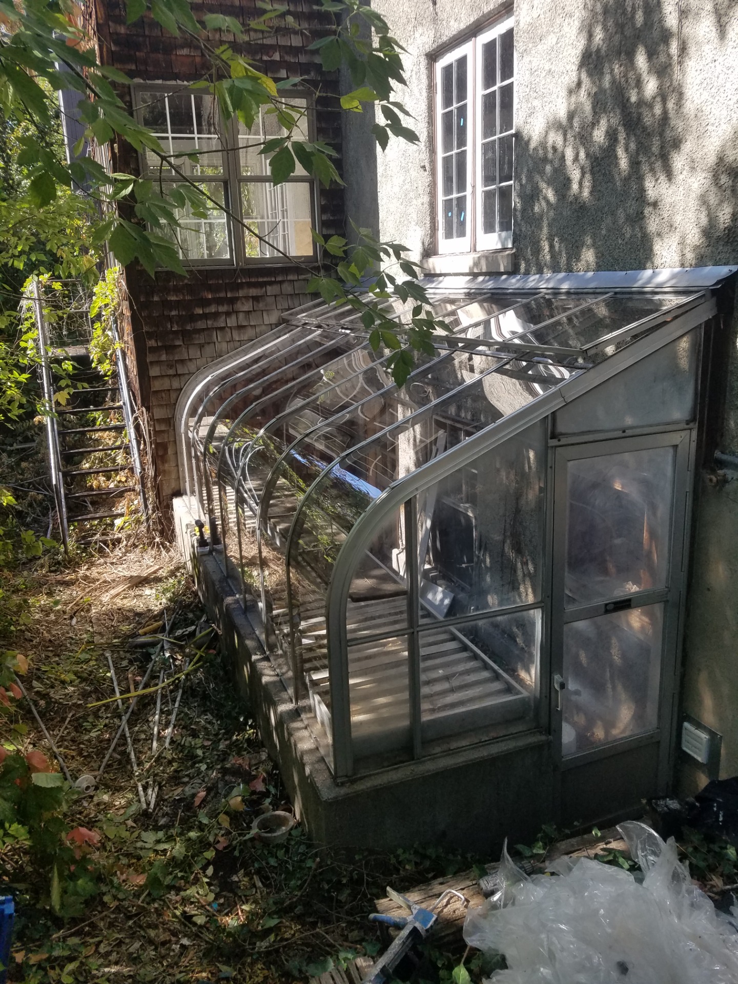 Here's a greenhouse that had been neglected so long the weed trees grew through the roof about 30ft high. The majority of the glass panels were broken including some of the curved panels. So after climbing the trees to cut them down about 8ft at a time, I purchased and cut out plexiglass to replace the old glass.